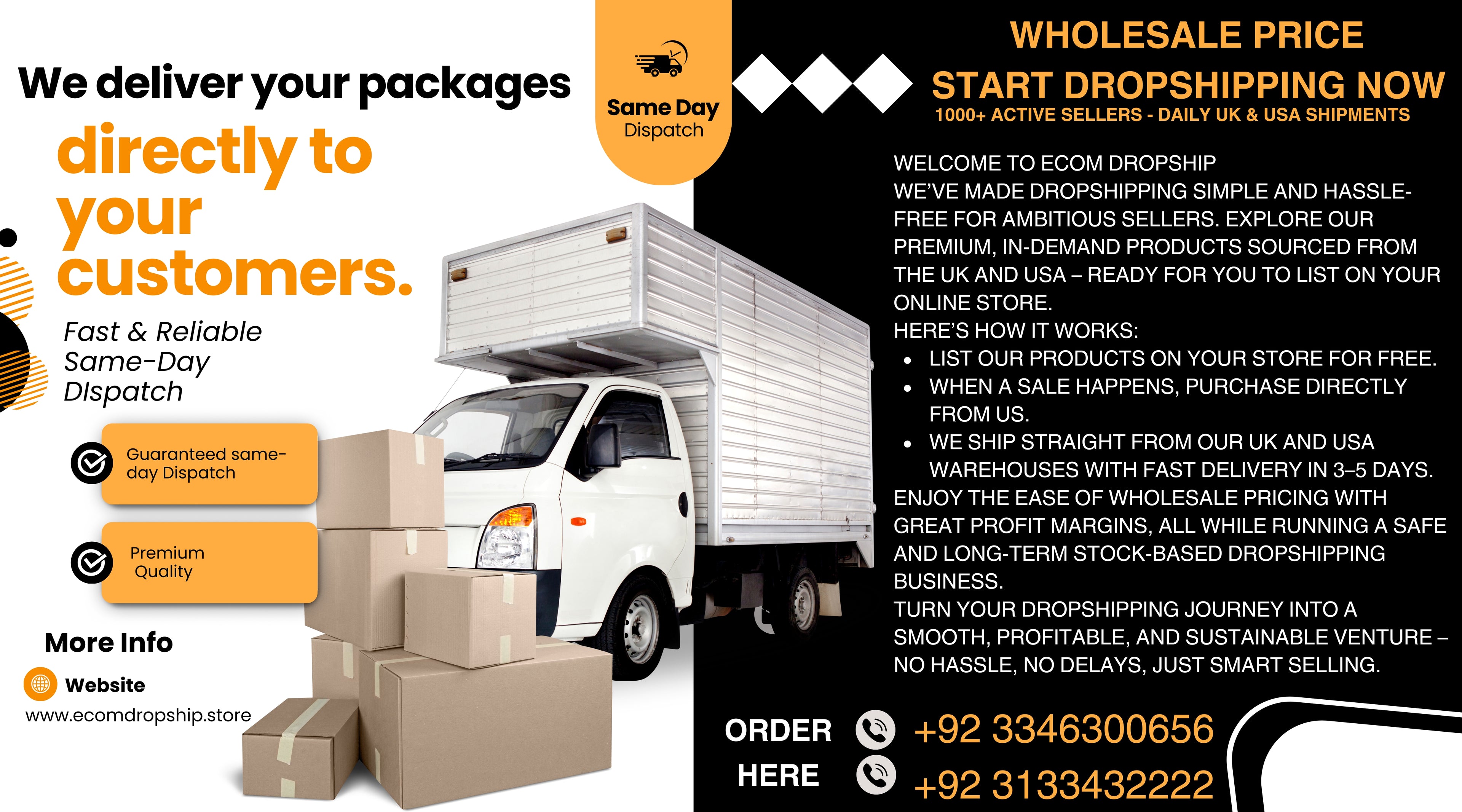 ap hamara product list kare, list karne ka tareeka apko hamary website pr mil jayega, us tareekay se ap hamara product list karen, jab apko order ajayega, ap hamain whatsapp karen, ap hamain image k sath customer ka address send karen ya shipping label send kare, sath me ju price hai woh send karen, hum same day ya next day dispatch kar den wahin se, Delivery 3 to 5 days me ho jayegy